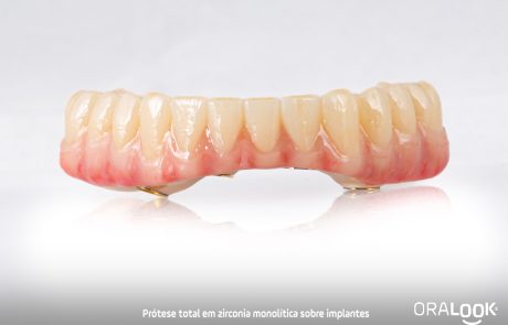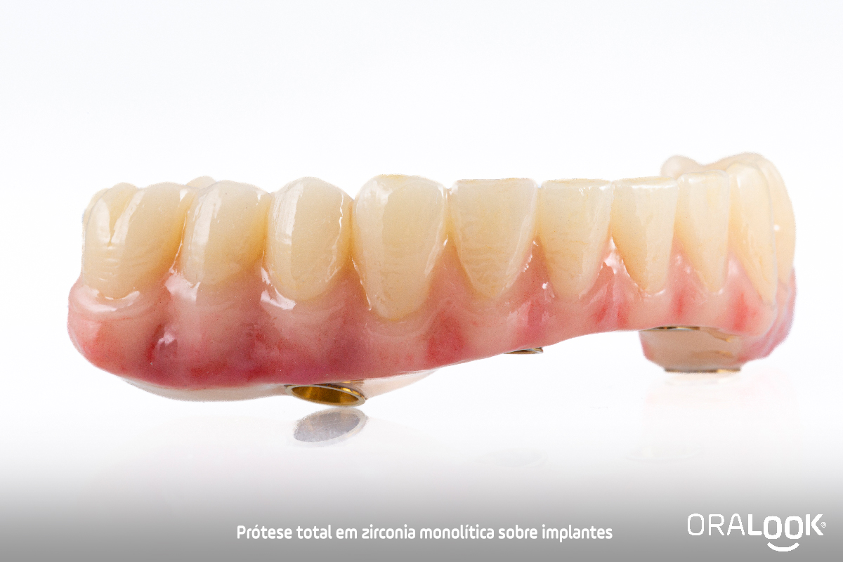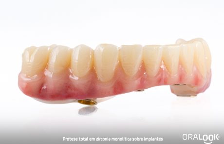 Prótese total inferior sobre implantes, em zircónia monolítica caracterizada.