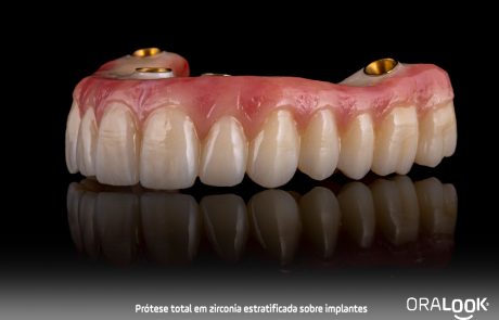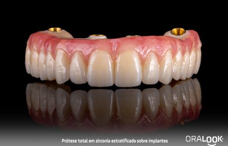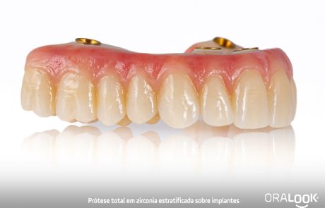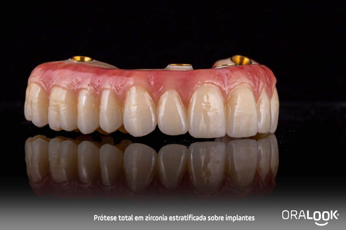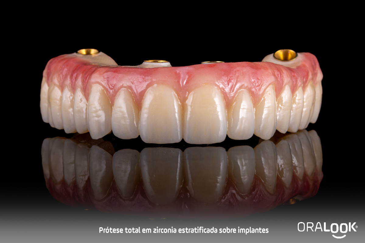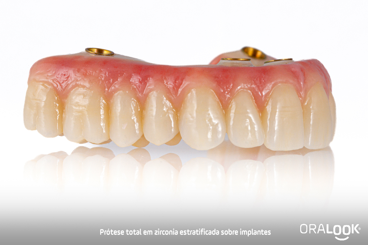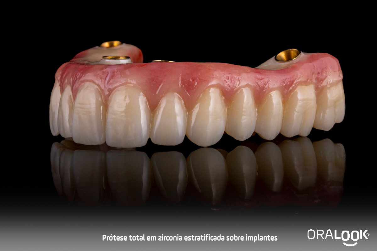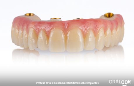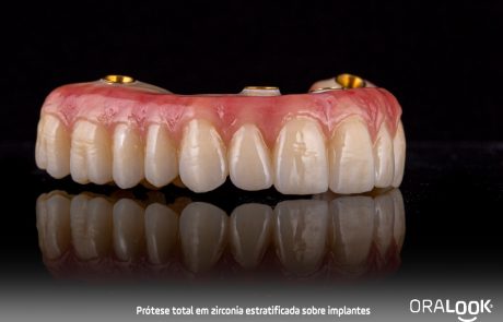 Prótese total superior sobre implantes, em zircónia estratificada.